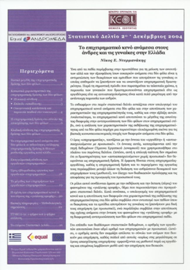 Το παρόν στατιστικό δελτίο εστιάζεται στον υπολογισμό του επιχειρηματικού κενού ανάμεσα στα δύο φύλα και στην αποτύπωση των χαρακτηριστικών της επιχειρηματικότητάς τους, καθώς και στην εξέλιξη αυτών. Αναλυτικότερα, το επιχειρηματικό κενό αποτυπώνει το μέγεθος της ανισότητας-διαφοράς στην αντιπροσώπευση των δύο φύλων στον επιχειρηματικό στίβο, ενώ η ανάλυση των χαρακτηριστικών της εκδήλωσης της επιχειρηματικότητας από τα δύο φύλα παρέχει μια περισσότερο ολοκληρωμένη εικόνα για τις βασικές κοινωνικοοικονομικές πτυχές των διαφορών ανάμεσα στους άνδρες και τις γυναίκες.