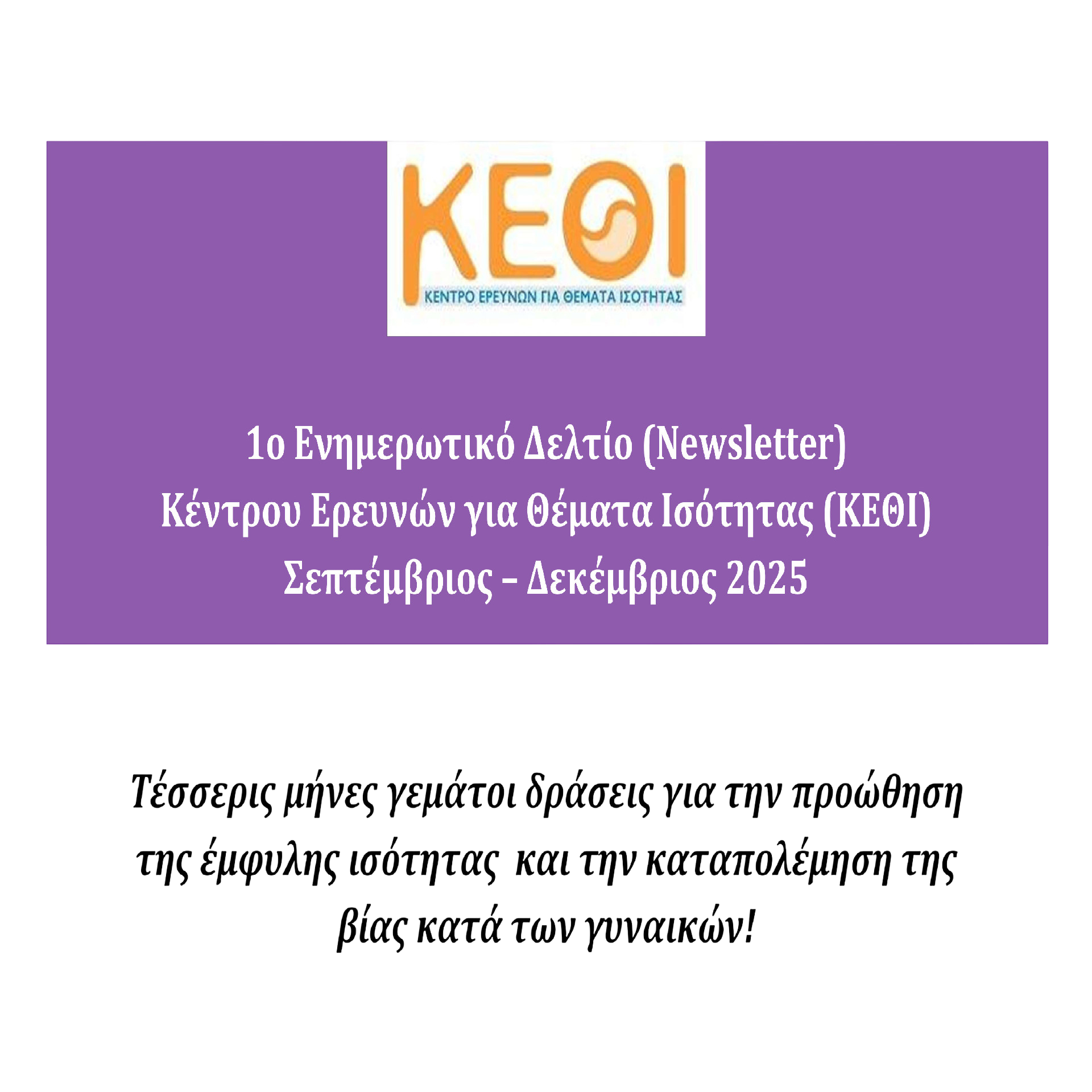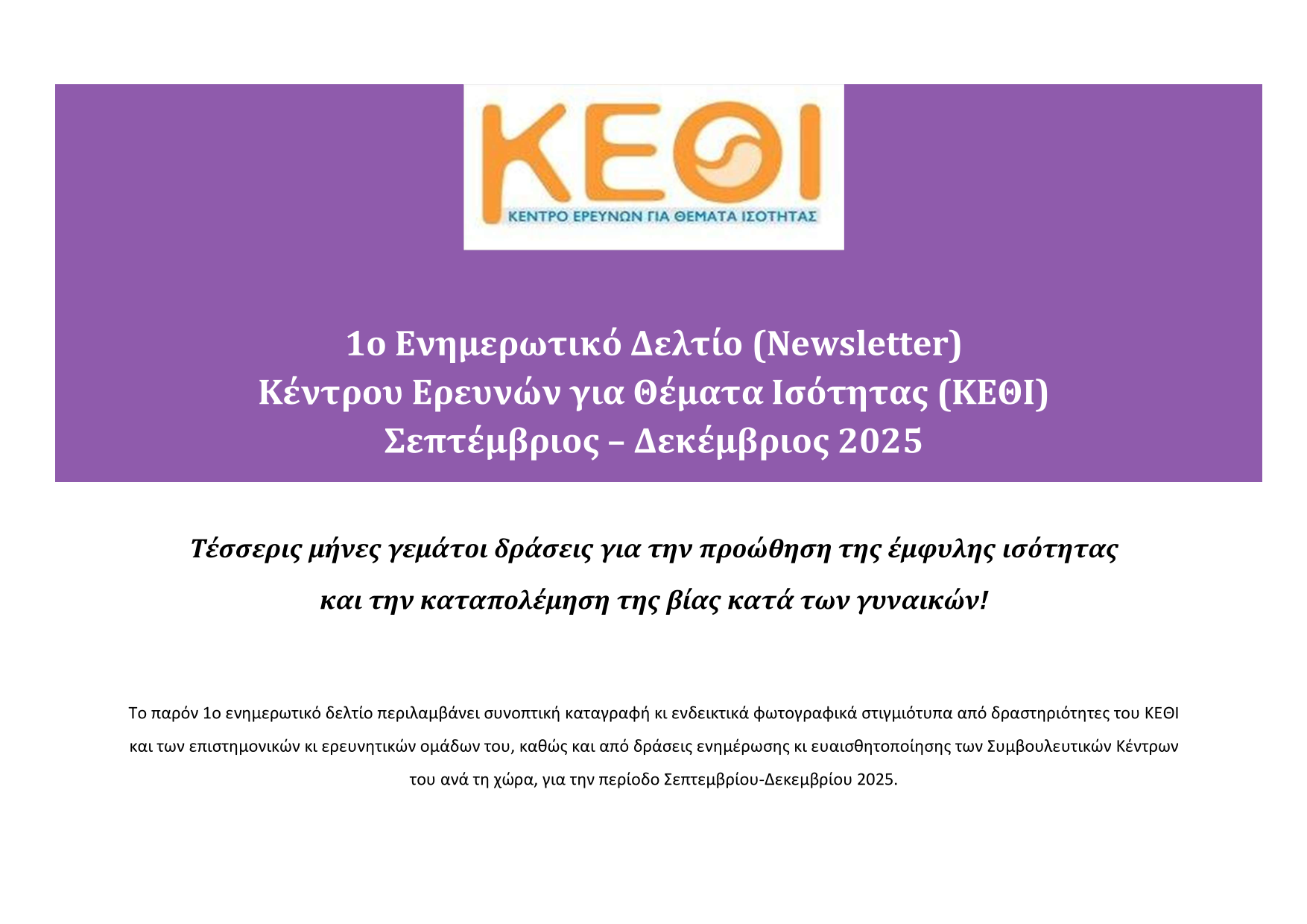 Το 1ο ενημερωτικό δελτίο περιλαμβάνει συνοπτική καταγραφή κι ενδεικτικά φωτογραφικά στιγμιότυπα από δραστηριότητες του ΚΕΘΙ και των επιστημονικών κι ερευνητικών ομάδων του, καθώς και από δράσεις ενημέρωσης κι ευαισθητοποίησης των Συμβουλευτικών Κέντρων του ανά τη χώρα, για την περίοδο Σεπτεμβρίου-Δεκεμβρίου 2025.
