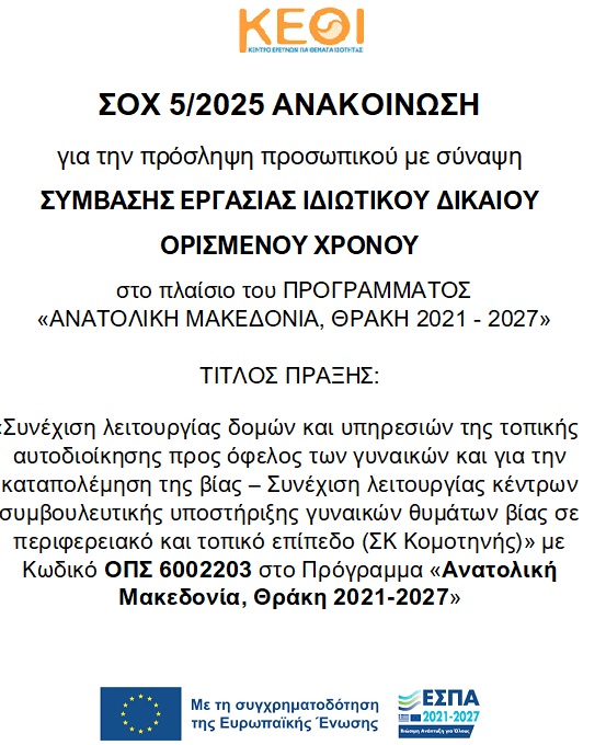 Ανακοινώνεται η πρόσληψη, με σύμβαση εργασίας ιδιωτικού δικαίου ορισμένου χρόνου, τριών (3) ατόμων, ειδικότητας ΠΕ Ψυχολόγων, ΠΕ ή ΤΕ Κοινωνικών Λειτουργών και ΠΕ Διοικητικού (Νομικών) για την κάλυψη αναγκών του Συμβουλευτικού Κέντρου Κομοτηνής του Κέντρου Ερευνών για Θέματα Ισότητας (ΚΕΘΙ) που λειτουργεί στο πλαίσιο υλοποίησης της Πράξης «Συνέχιση λειτουργίας δομών και υπηρεσιών της τοπικής αυτοδιοίκησης προς όφελος των γυναικών και για την καταπολέμηση της βίας – συνέχιση λειτουργίας κέντρων συμβουλευτικής υποστήριξης γυναικών θυμάτων βίας σε περιφερειακό και τοπικό επίπεδο (ΣΚ Κομοτηνής)», με Κωδικό ΟΠΣ 6002203 και ένταξη στο Πρόγραμμα «Ανατολική Μακεδονία, Θράκη 2021-2027».
