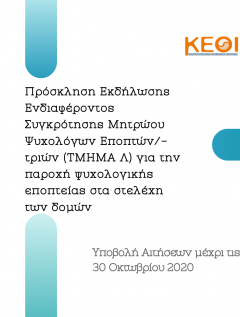 Το Κ.Ε.Θ.Ι. ανακοινώνει την πρόσληψη, με σύμβαση εργασίας ιδιωτικού δικαίου ορισμένου χρόνου, ενός (1) ατόμου για την κάλυψη εποχικών ή παροδικών αναγκών του για τις ανάγκες του Συμβουλευτικού Κέντρου Μυτιλήνης, στο πλαίσιο υλοποίησης του Υποέργου (1) «Στελέχωση και Λειτουργία